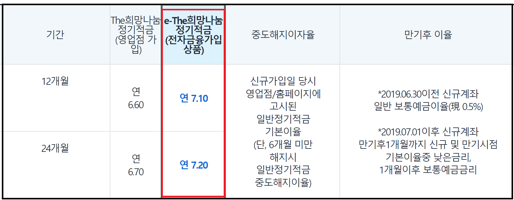 e-The희망나눔 정기적금은 12개월로 가입 시 연7.10% , 24개월 가입시 연 7.20%(우대이율포함)로 가입기간별로 최종금리가 조금씩 다릅니다.