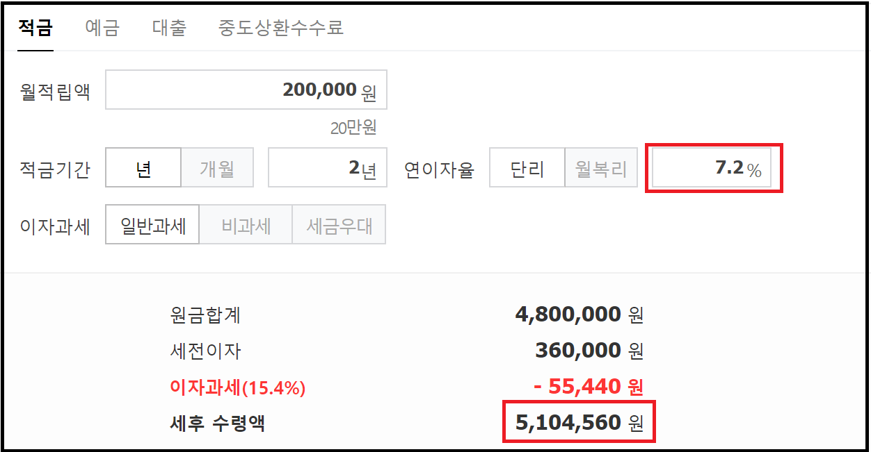 ※ 가능한 월납입액과 금리 7.20% 입력 후 자유롭게 만기 이자를 계산해 보세요