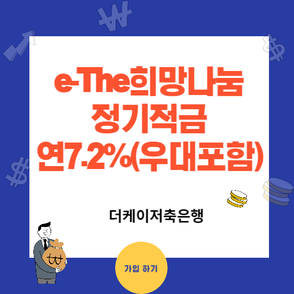 더케이 저축은행의 e-The희망나눔 정기적금은 사회적으로 배려가 필요한 경제 빈곤층에게 고금리 혜택을 주는 적금입니다. 가입 대상자라면 무조건 가져갈 수 있는 금리이기 때문에 e-The희망나눔 정기적금에 가입할 수 있는가 입 대상과 가입방법에 대해서 설명해 드리겠습니다.