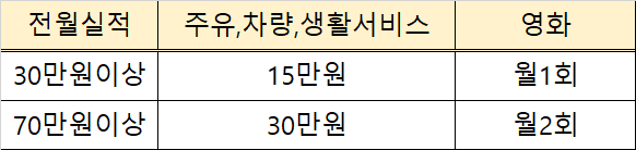 전월 실적에 따라 ( 30만 원 / 70만 원 이상 ) 할인받을 수 있는 대상금액과 사용 횟수 제한이 있습니다.