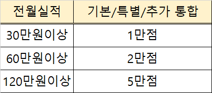 <카드의 정석 POINT>는 포인트 적립카드 중에서도 혜택이 좋은카드로 손에 꼽히는데요. 전월실적 30만원/60만원/120만원 구간에 따라 특별포인트를 최대 3%인 5만점까지 적립이 가능합니다.