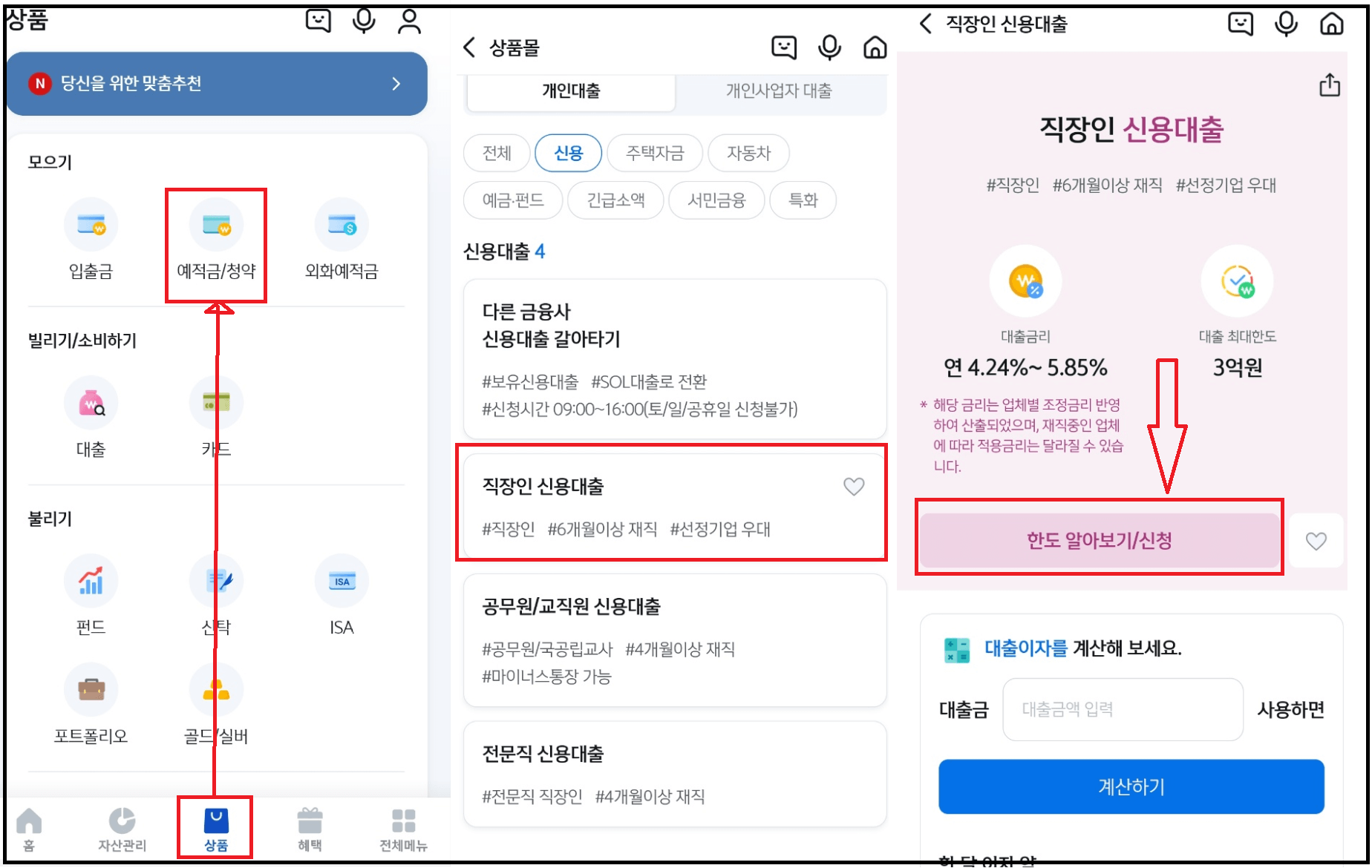 은행 방문이나 서류 준비가 어려운 직장인이라면 , 신한은행의 한도와 간편가입인 '쏠편한 직장인 대출신청' 을 이용해 보시기 바랍니다.