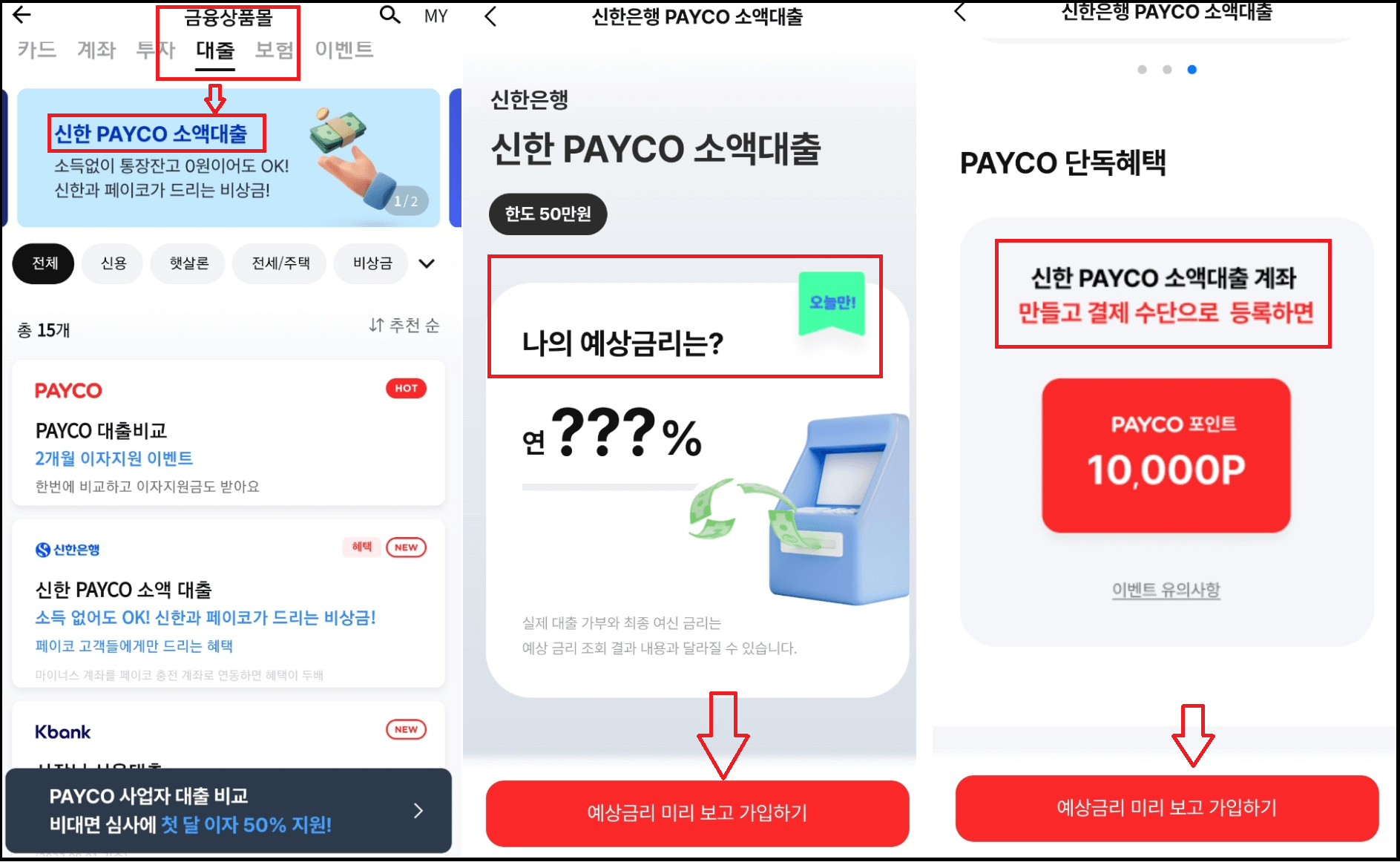 페이코 앱 접속 ▶ 금융상품몰에서 '대출' ▶ 신한 PAYCO소액대출 ▶ 예상금리 미리 보고 가입하기