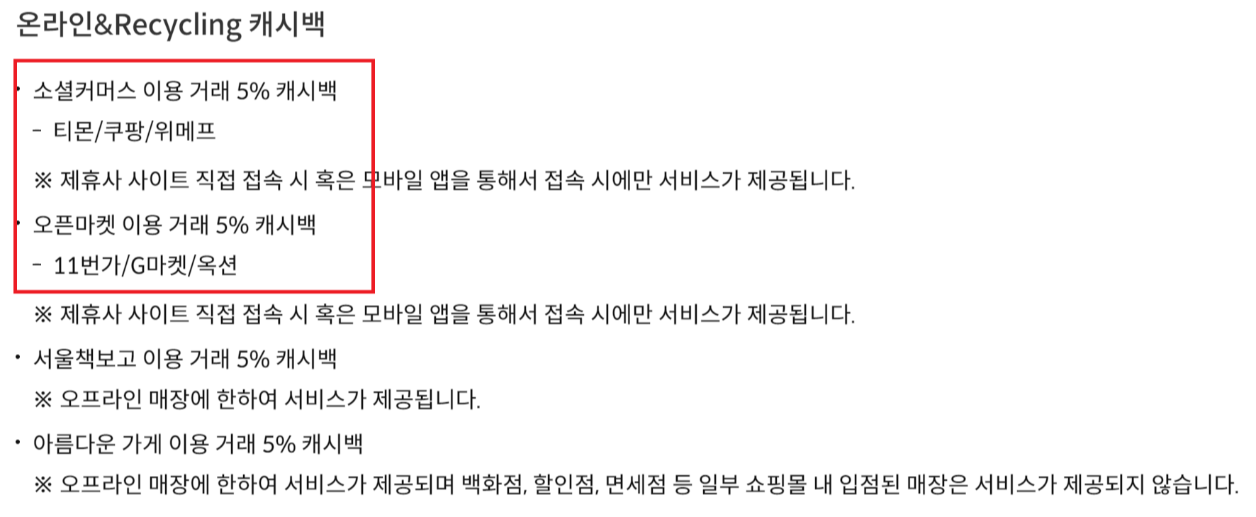 내용을 좀더 자세히 보면 이용 가맹점이 나오는데요. 해당 사이트를 이용하실 때 주의사항에 보면 제휴사사이트에 직접 접속하셔야 혜택이 제공됩니다. 다른사이트 경유하면 안 됩니다.