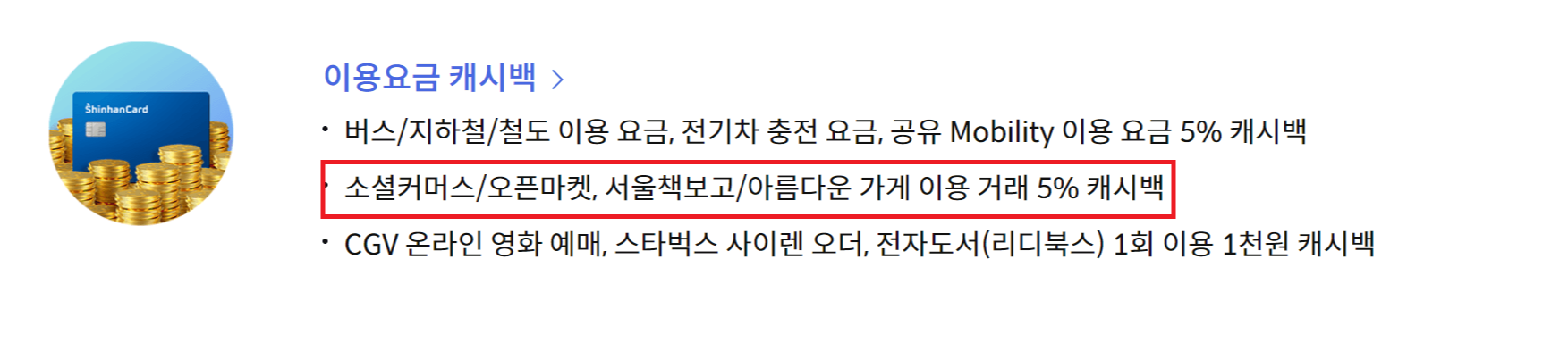 제가 설명드릴 부분은 이용요금 캐시백 > 소셜커머스/오픈마켓 거래 5% 캐시백 부분입니다. 예를 들어 티몬/쿠팡/위메프 그리고 11번가/G마켓/옥션 에서 온라인 거래 시 거래금액의 5%가 캐시백이 되는데요. 최대 3만원까지 캐시백이 되려면 이용금액이 60만 원이 필요합니다.