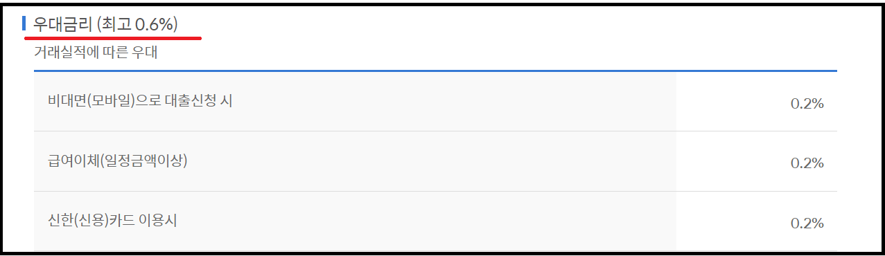 우대금리 조건은 다음의 3가지 거래실적을 채우면 최대 0.6% 받을 수 있습니다.