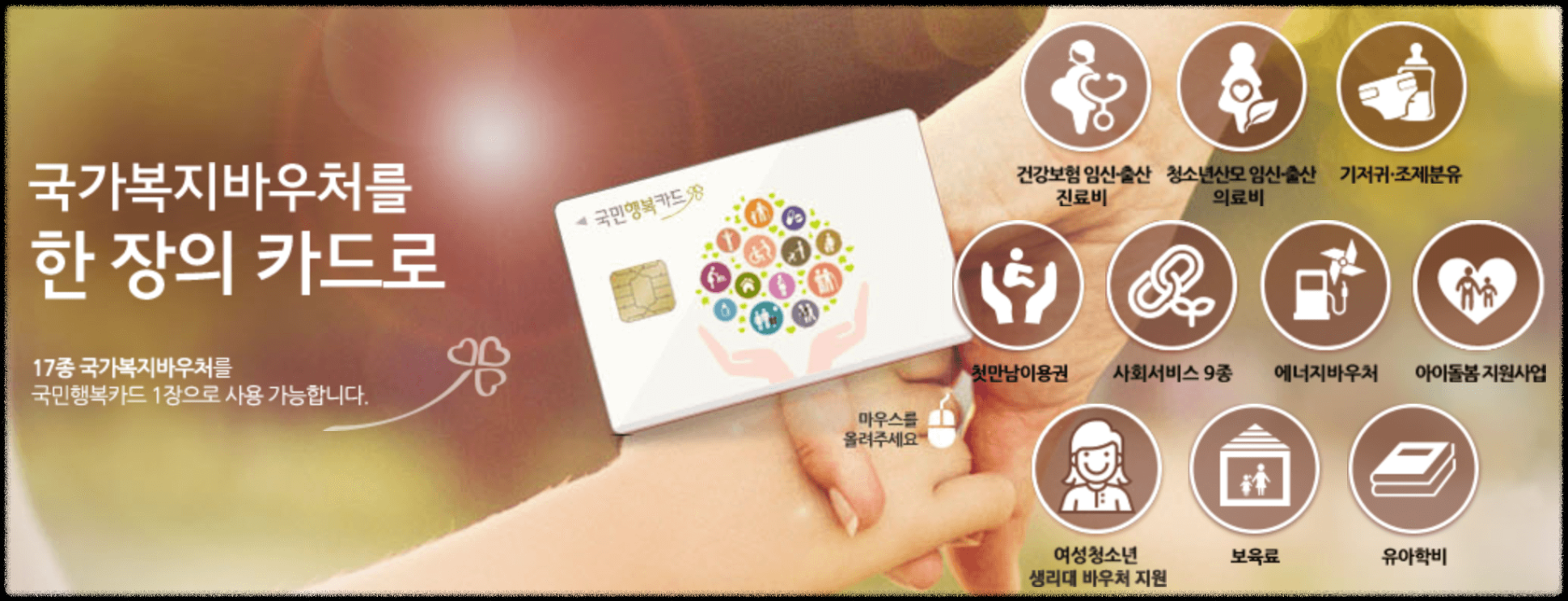 건강보험에 가입한 임산부에게 임신과 출산 시 지원하는 고운 맘카드와 만 18세 이하 산모 맘 편한 카드. 그밖에 사회서비를 지원받을 수 있는 희망 e 든 카드 등 해당복지를 사용하기 위해 발급을 각각 받아야 했었습니다. 이제는 17종 국가복지바우처를 국민행복카드 하나로 이용할수 있게 통합되었습니다.