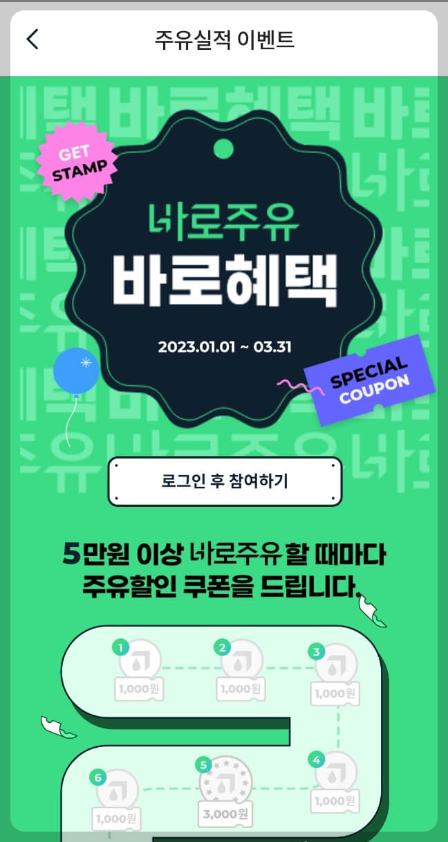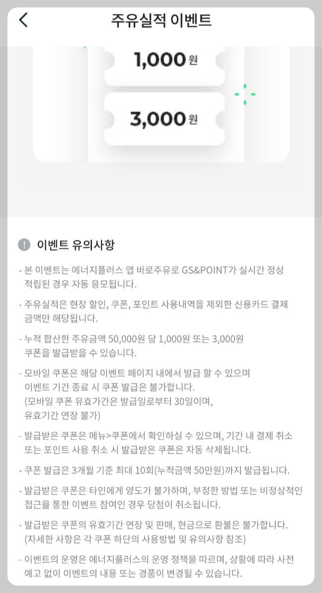 5만 원 이상 바로 주유할 때마다 주유할인 쿠폰을 드리는 이벤트가 진행 중입니다. 이벤트는 에너지플러스 앱 바로주유로 GS포인트 적립 시 자동으로 응모가 되며, 주유금액이 누적, 합산 5만 원 이상이 되면 5만 원당 1,000원이나 3,000원 주유쿠폰을 발급받을 수가 있습니다. 이벤트는 언제든 바뀔 수가 있으니 참고부탁드립니다.