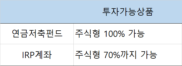 DC나 IRP계좌에서 100%까지 투자 가능한 상품이 있고, 총적립금의 70%만 투자 가능항 상품이 나눠져 있습니다.