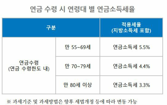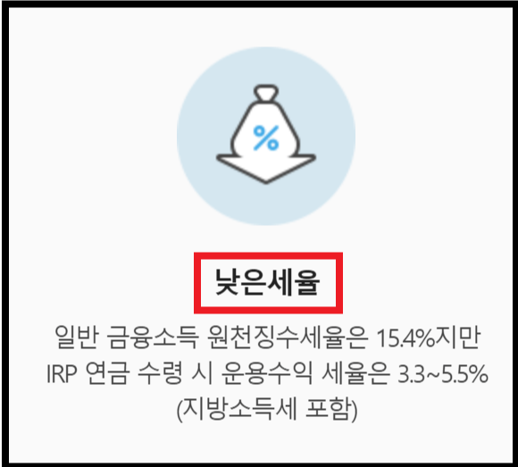 일반계좌에서 금융소득이 발생하면 원천징수세율은 15.4% 떼지만, 퇴직연금( IRP ) 계좌는 는 연금 수령 시 연령에 따라 운용수익 3.3 ~ 5.5%만 부과됩니다.