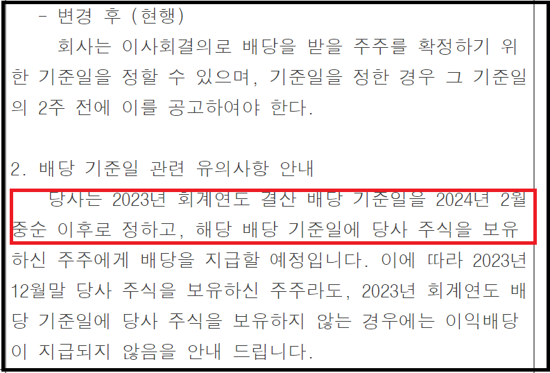 배당 기준일을 정하면 기준일 2주전에 공고합니다. 2023년 12월 말 당사 주식 보유자가 다음해 배당 기준일까지 주식 보유시 배당이 지급된다고 합니다.