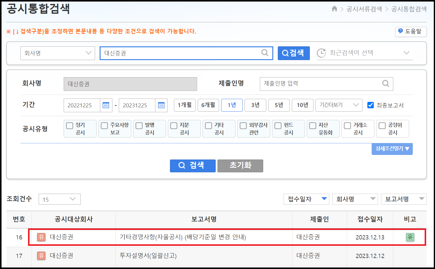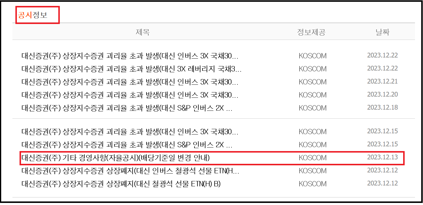 대신증권(003540)은 12.13일자 공시를 통해서 배당기준일을 내년 2월 이후로 변경한다고 하였습니다. 보유주식 공시 확인하는 방법은 동일하니, 먼저 대신증권으로 공시 확인하는 순서를 보겠습니다.