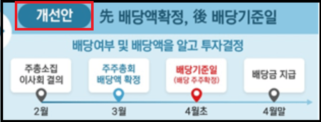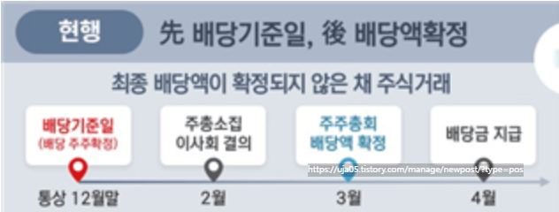 다음해 3월에 주총을 통해 배당액을 알수 있다는 것은 현재와 동일하나, 배당금이 확정된 이후 4월에 배당기준일에 맞춰 매수해야 4월말에 배당금을 지급합니다.