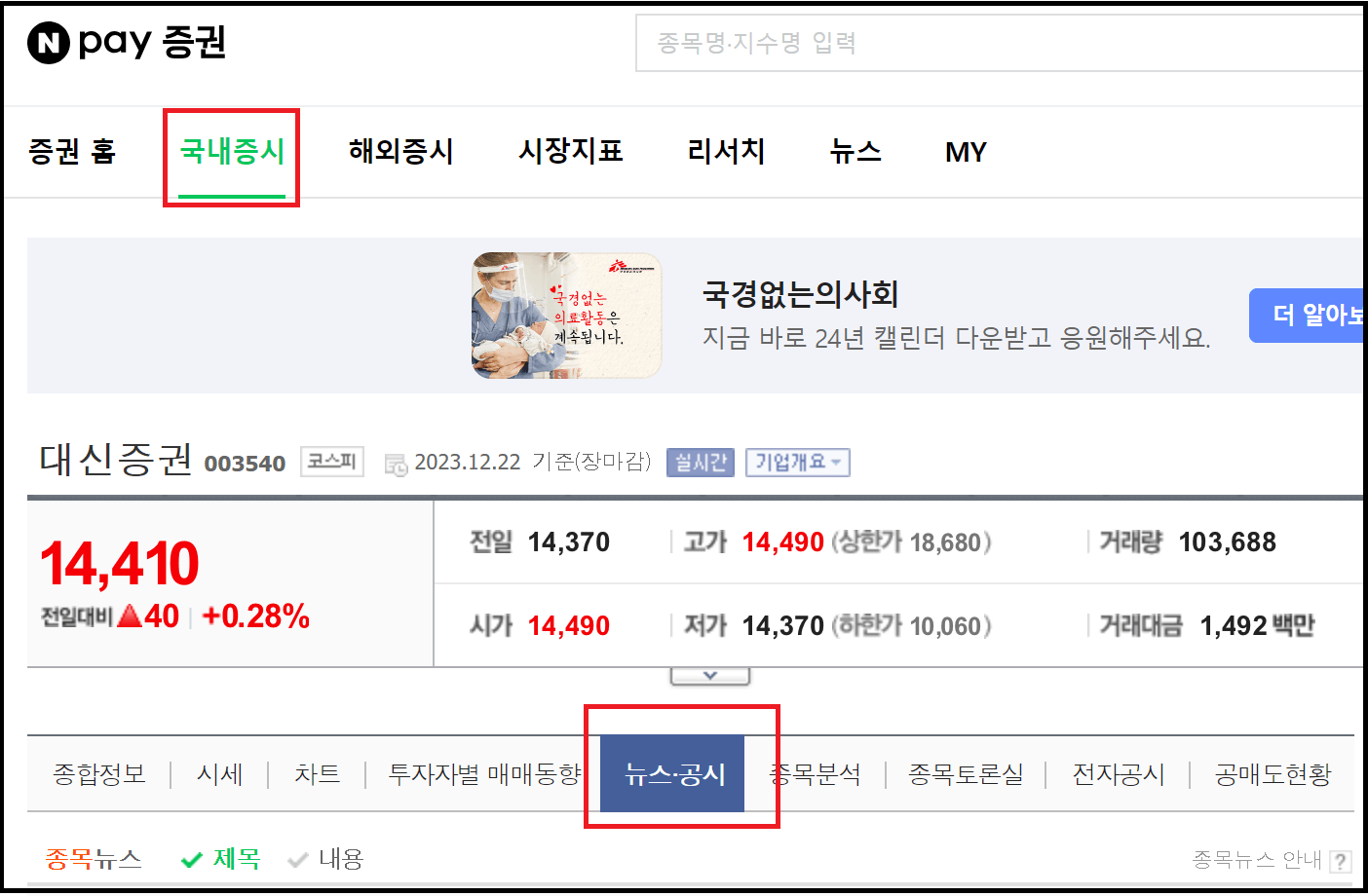 - 네이버에서 네이버증권 ▶ 국내증시 ▶ 종목 대신증권 조회 ▶ 뉴스.공시 탭
