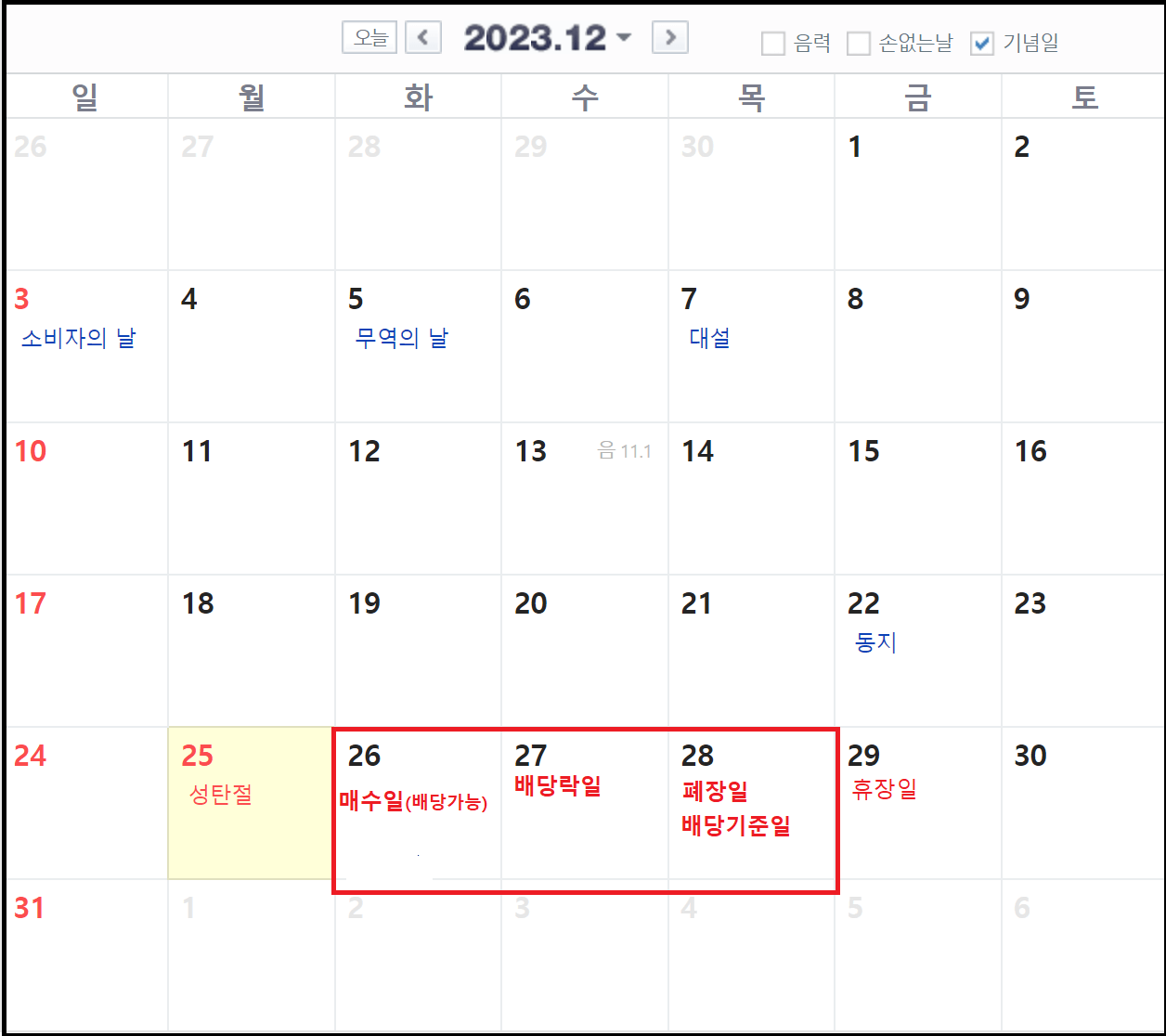 - 12.26일(화) 연말결산 배당을 받기 위해 마지막으로 매수 가능한 날짜