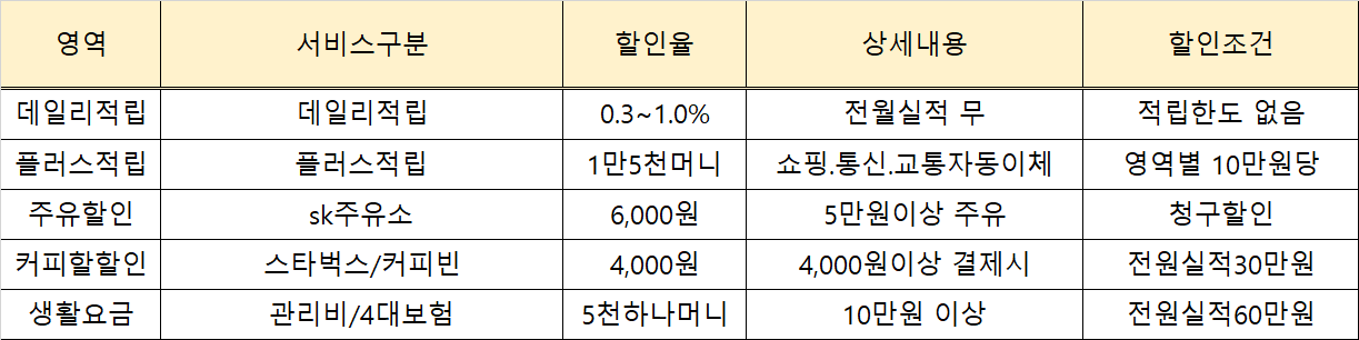 하나 1Q Daily+ 카드는 전월실적 상관없이 0.3~1.0%까지 적립한도 없이 포인트 적립이 가능합니다. 관리비나 4대 보험 결제 시 최대 5천 하나머니 적립을 받을 수 있습니다. 그밖에 주유소 할인과 스타벅스 같은 커피 할인 서비스도 이용이 가능합니다.