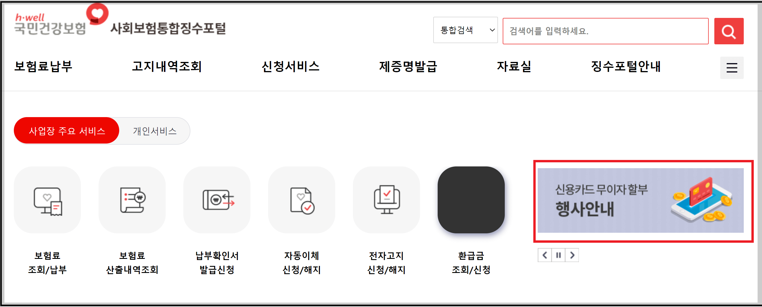 ⑤ 사회보험통합징수포털 사이트 내 '신용카드무이자 행사안내 배너'를 통해서 무이자 할부기간이 안내되어 있습니다. 보통 2~7개월까지 무이자 가능합니다.