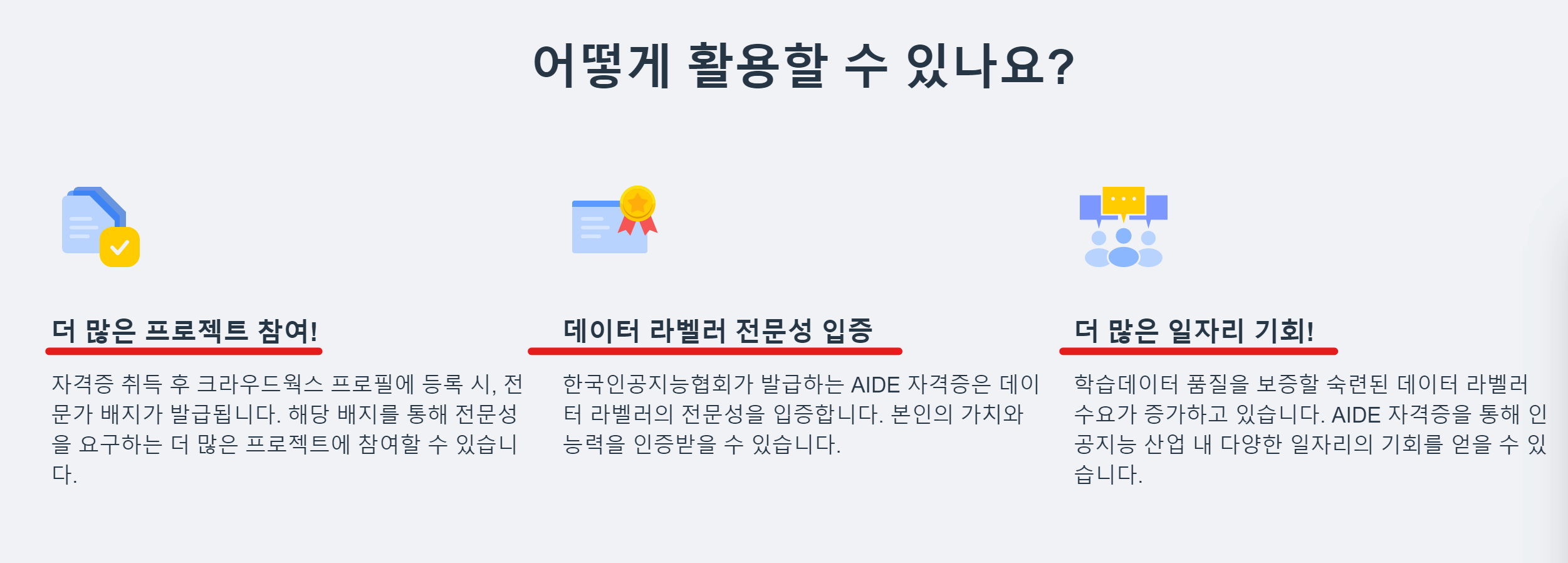 40대. 50대 추천 자격증인 데이터라벨러는 기초 수준의 인공지능 관련 이론과 실무 활용사례를 배우게 되고, 다양한 실습을 통해서 데이터 라벨링 방법을 학습하길 원하시는 분께 AIDE 2급 자격증을 추천합니다.( 국민내일 배움 교육 수료자 대상 ADIE 2급 교육도 있습니다.)