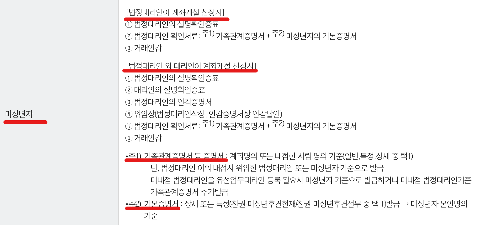 1. 법정대리인의 실명확인증표(신분증.운전면허증) 2. 가족관계증명서 (계좌명의 또는 내점한 사람명의 기준 , 일반,상세,특정 선택1) 3. 미성년자의 기본증명서 (상세 또는 특정) 4. 거래인감 |